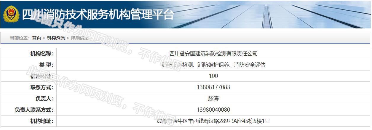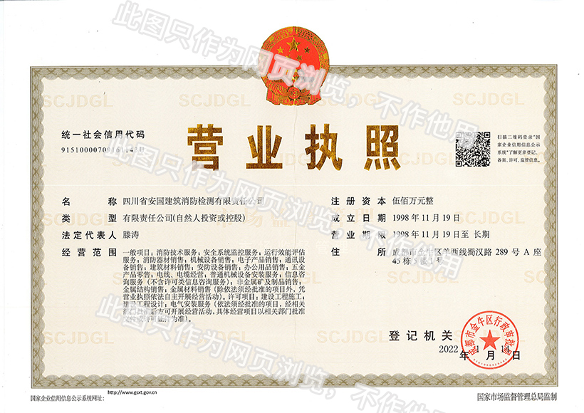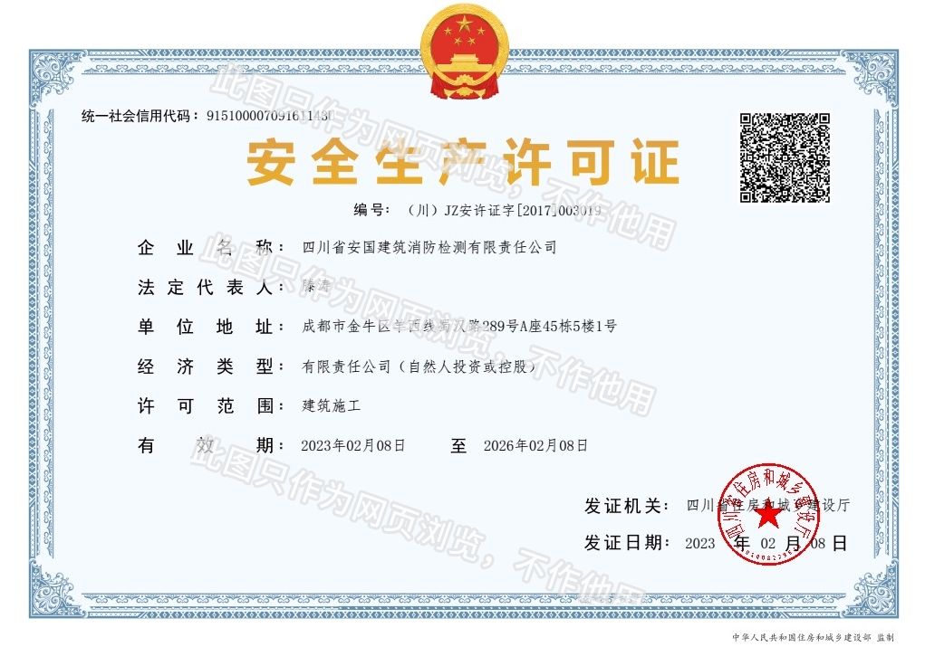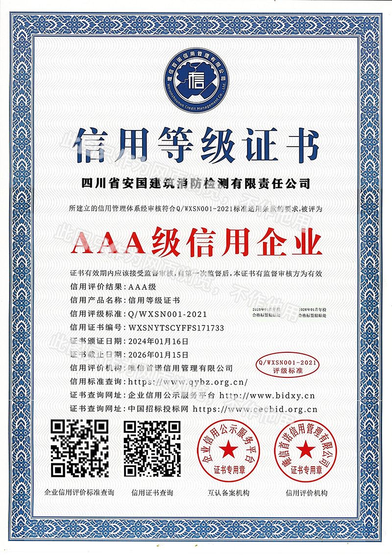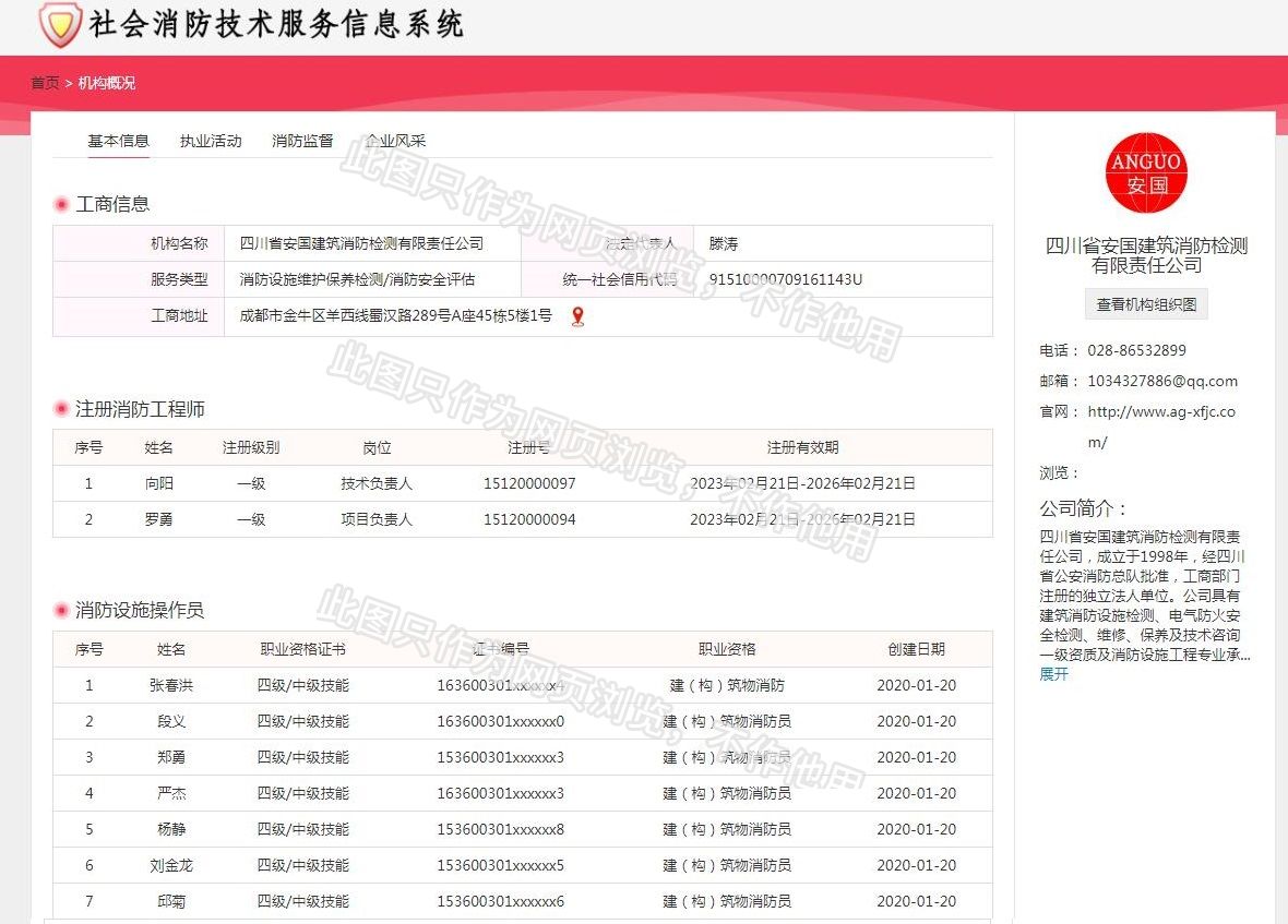 四川省安國(guó)建筑消防檢測(cè)有限責(zé)任公司,成立于1998年,經(jīng)四川省公安消防總隊(duì)批準(zhǔn),工商部門注冊(cè)的獨(dú)立法人單位。 公司具有建筑消防設(shè)施檢測(cè)、電氣防火安全檢測(cè)、維修、保養(yǎng)及技術(shù)咨詢一級(jí)資質(zhì)的中介技術(shù)服務(wù)機(jī)構(gòu),獲得CMA計(jì)量認(rèn)證。主要業(yè)務(wù)范圍是:接受建設(shè)單位或有關(guān)單位委托,承擔(dān)新建、改建、擴(kuò)建建筑自動(dòng)消防設(shè)施技術(shù)檢測(cè)、電氣防火安全檢測(cè)、以及承接建筑消防設(shè)施維護(hù)保養(yǎng),對(duì)已交付使用的建設(shè)消防設(shè)施的運(yùn)行情況進(jìn)行運(yùn)行檢測(cè),開展建筑消防設(shè)施的消防安全技術(shù)咨詢。公司設(shè)辦公室、總工辦、財(cái)務(wù)部、檢測(cè)部、維保部等職能機(jī)構(gòu),擁有一